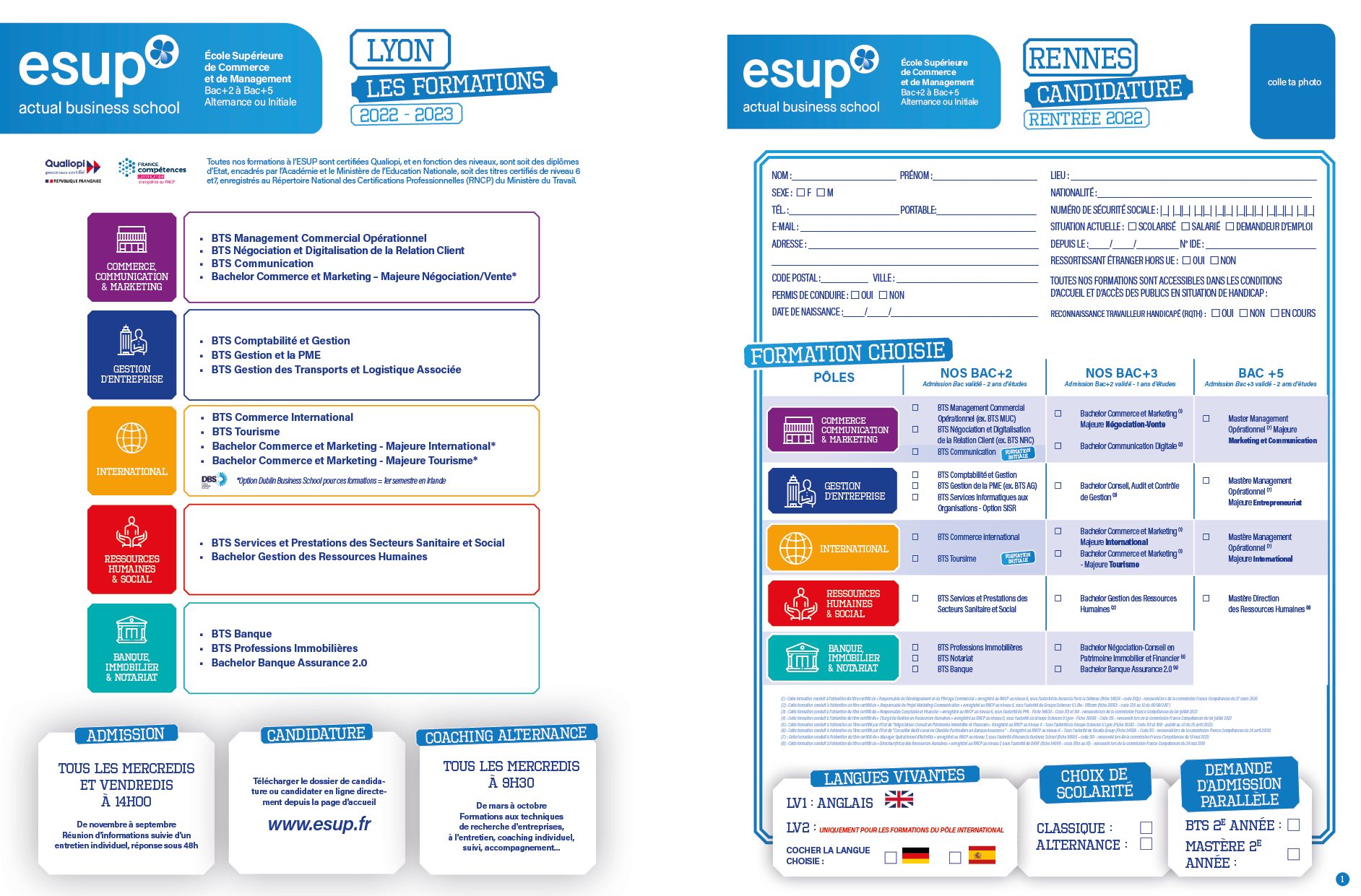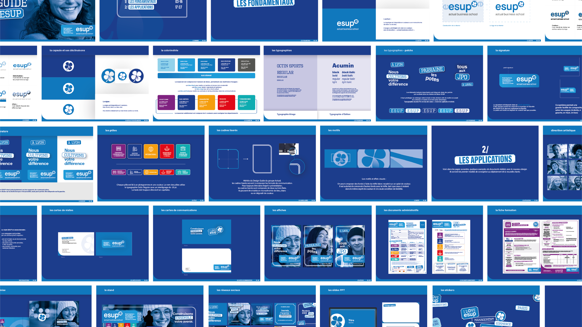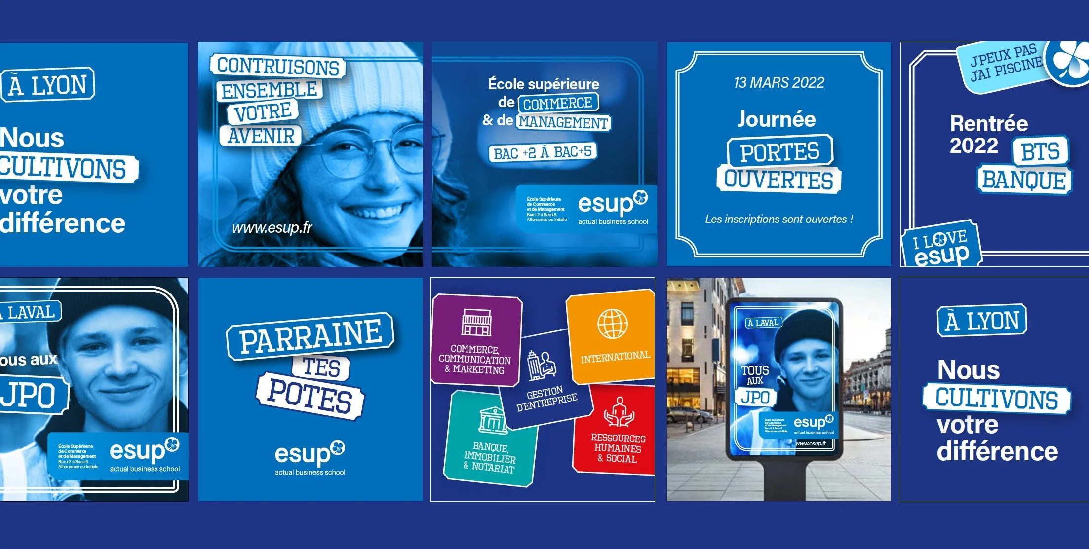 La mise en page d’ESUP repose sur des jeux typographiques dynamiques. Les messages clés s’intègrent dans des stickers aux teintes de bleu ESUP, apportant rythme et impact visuel.